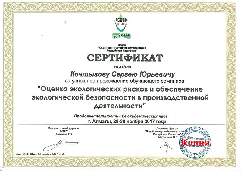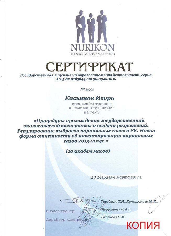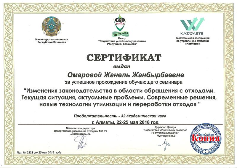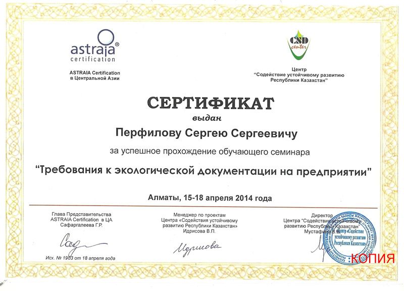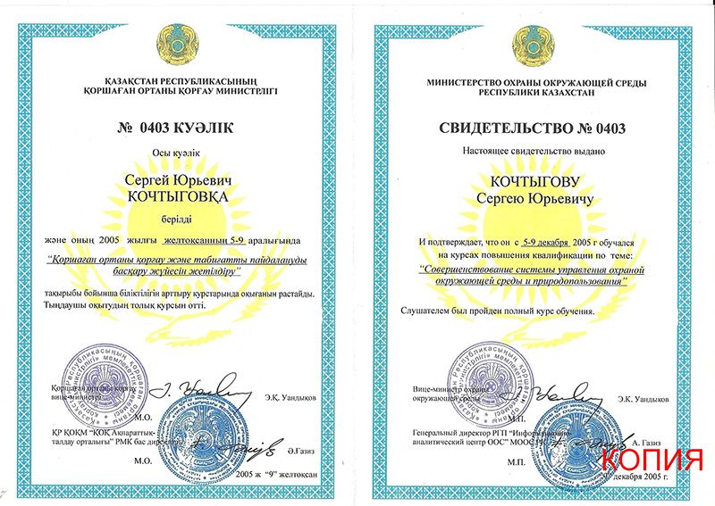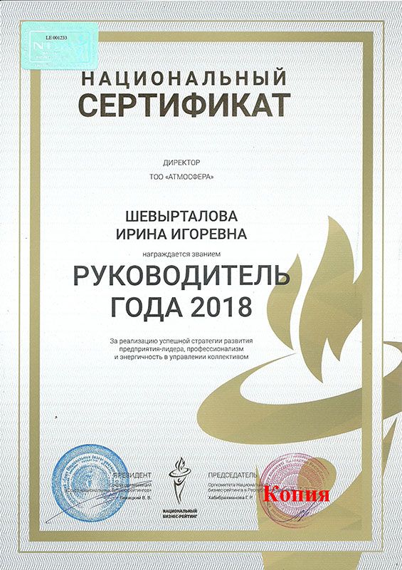 Сотрудники нашей компании постоянно повышают свой профессиональный уровень. За время деятельно ТОО «Атмосфера» получено множество сертификатов и удостоверений о прохождении курсов повышения квалификации от государственных и ведомственных организаций.